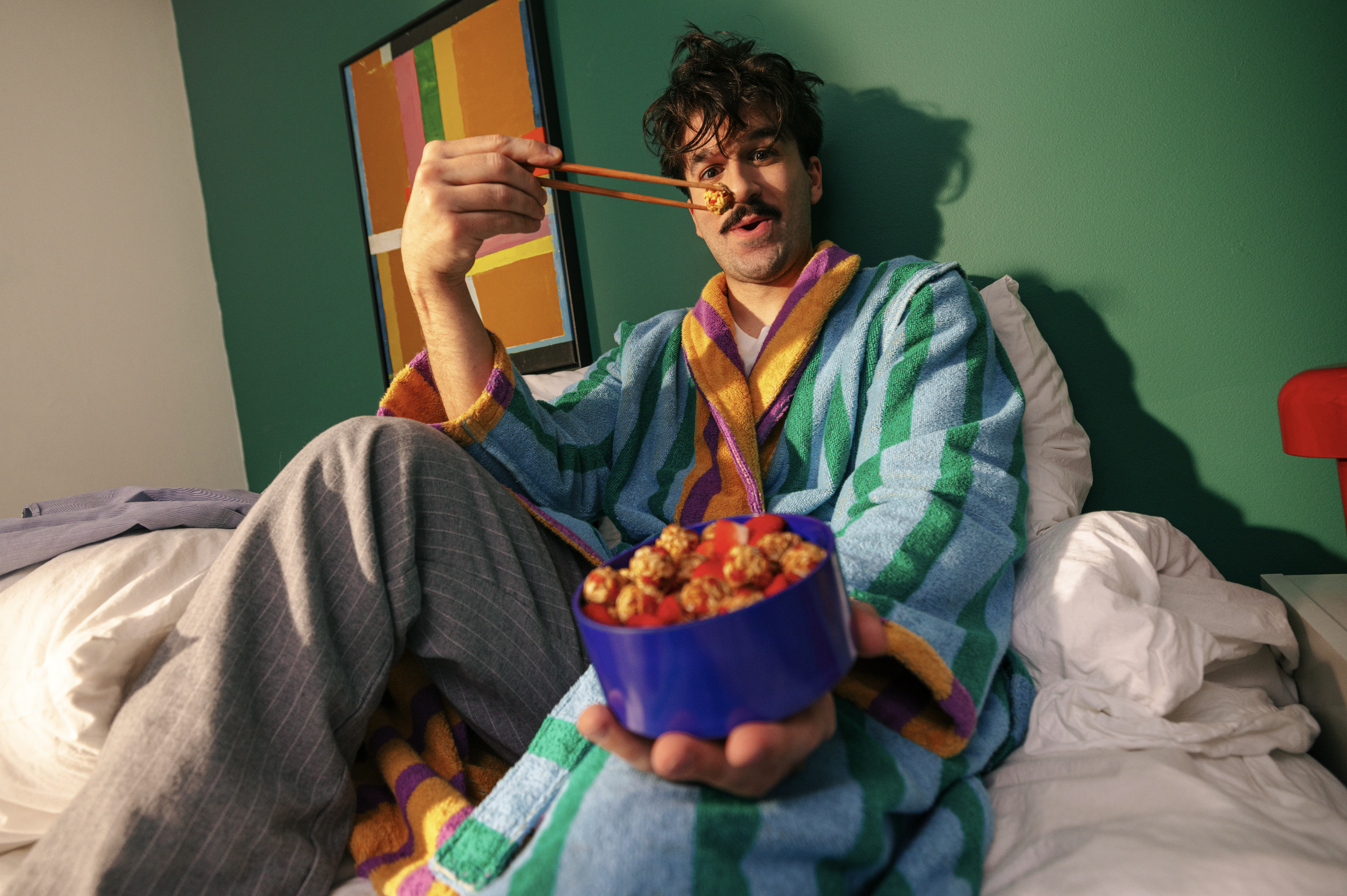 The box becomes the transition device — morphing into a bouquet, an outfit, sunglasses, and more, before leading us into real-life snackable moments